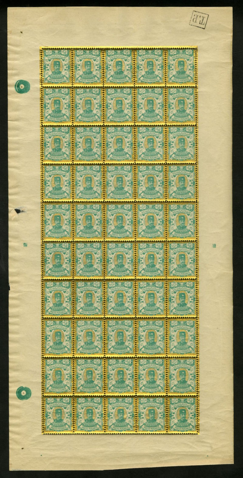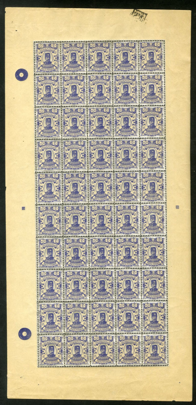 1417 nh, bl   imageLARGE LOTS AND COLLECTIONS IRAN (97,98,100) 1894 Nasser-edin Shah Qajar, 2kr, 5kr and 50kr sheets of 50, n.h., couple of minor flaws, mostly fine-v.f. (catalogued as hinged singles) cat. Value $3150 (Image) (Image 2) (Image 3) (All Images)