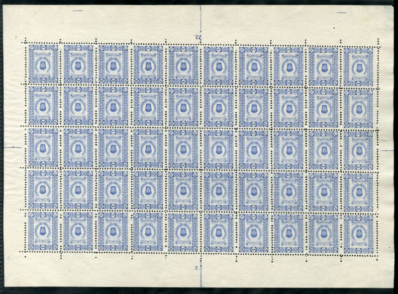 1416 ng, bl   imageLARGE LOTS AND COLLECTIONS IRAN 1889 2s blue, imperforate cross-gutter sheet of 100, printed from four separate cliches in Paris, unused without gum, some faults and paper separations, still a good presentation of the four dies, ideal for studying the settings in each pane, possibly unique multiple (Image)