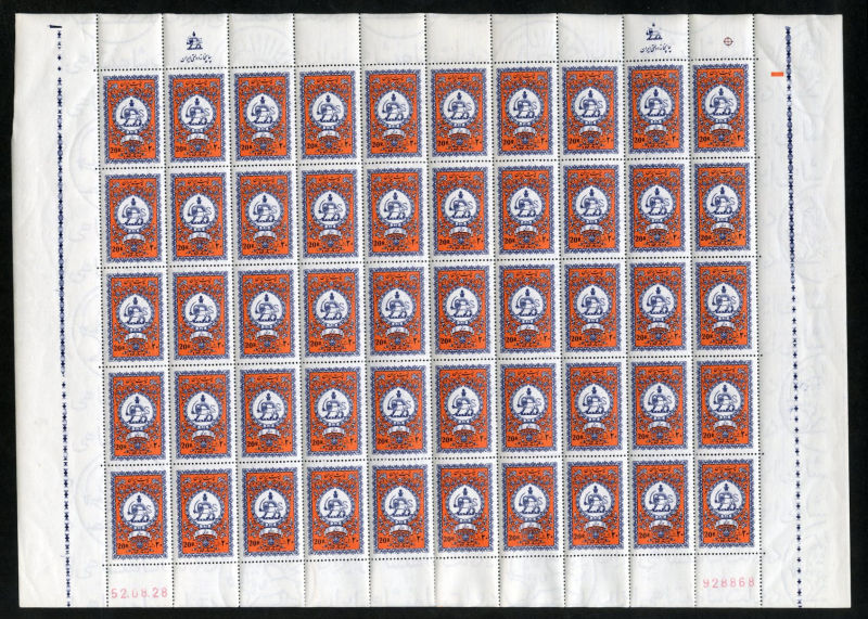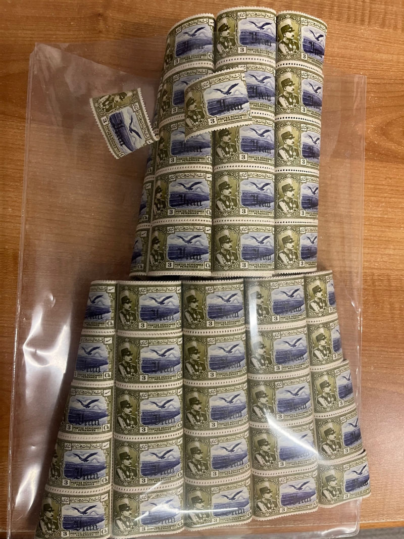 1423 nh, bl   imageLARGE LOTS AND COLLECTIONS IRAN Air Post 1935 "Iran" overprints, group of 27 sheets of 50, various denominations, n.h., but there is extensive curling and some stamps may have fallen off, high catalogue value (Image)
