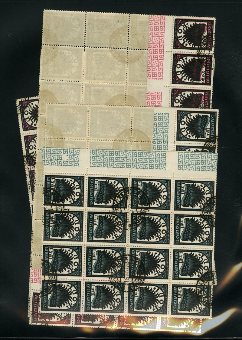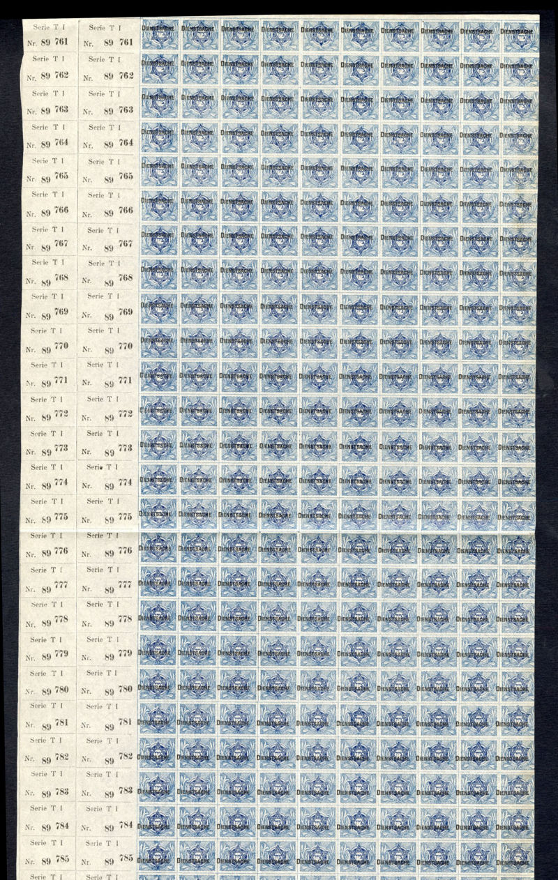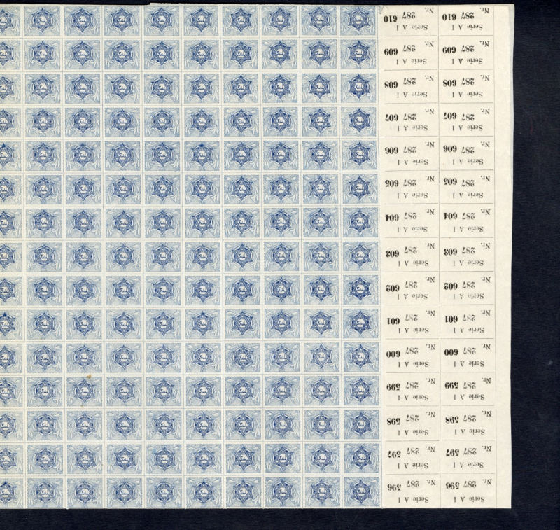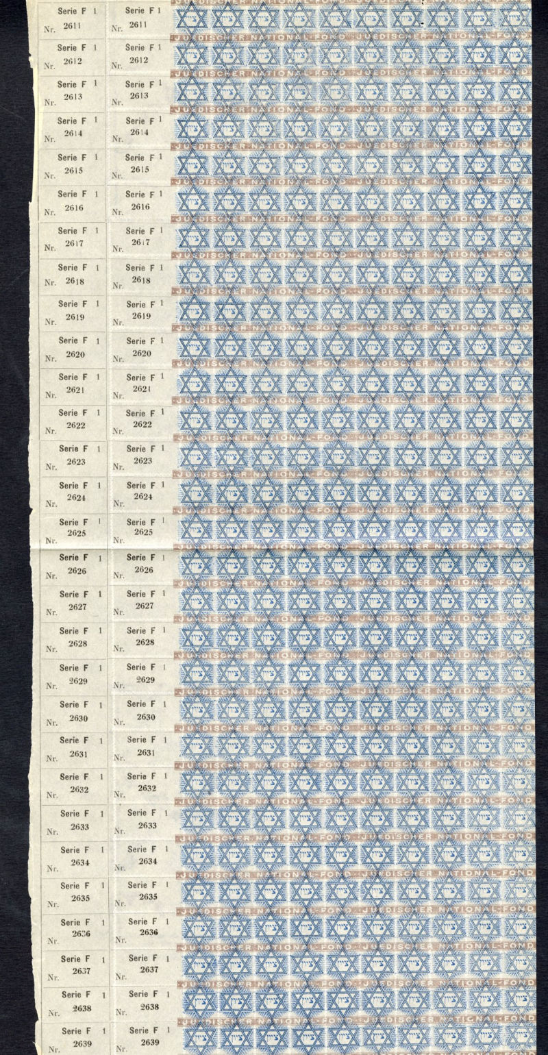 1428 og, ng, bl   imageLARGE LOTS AND COLLECTIONS ISRAEL 1920 Jewish National Fund, three rouletted panes of 300, each with coupons at left, first "Serie A I", unused without gum; another "Serie T I" overprinted "Dienstmarke", with gum (some minor toning); last one smaller size "Serie F", "Juedischer National-Fond" underprint in brown, folded between and occasionally through the stamps, otherwise fine-v.f. (Image) (Image 2) (Image 3) (Image 4) (All Images)