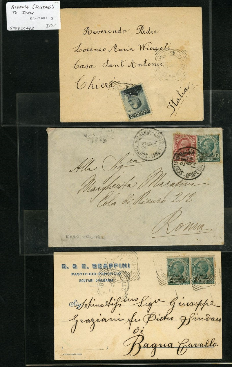 1433 c   imageLARGE LOTS AND COLLECTIONS ITALIAN OCCUPATION OF ALBANIA 1908-15 selection of 10 covers or cards, mostly franked with Italian Offices in Levant, Durazzo, Scutari overprints, one mixed franking Italian and "Levante" Special Delivery sent from Valona to Ferrara, military card, etc., mixed condition (Image) (Image 2) (All Images)