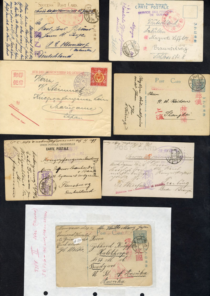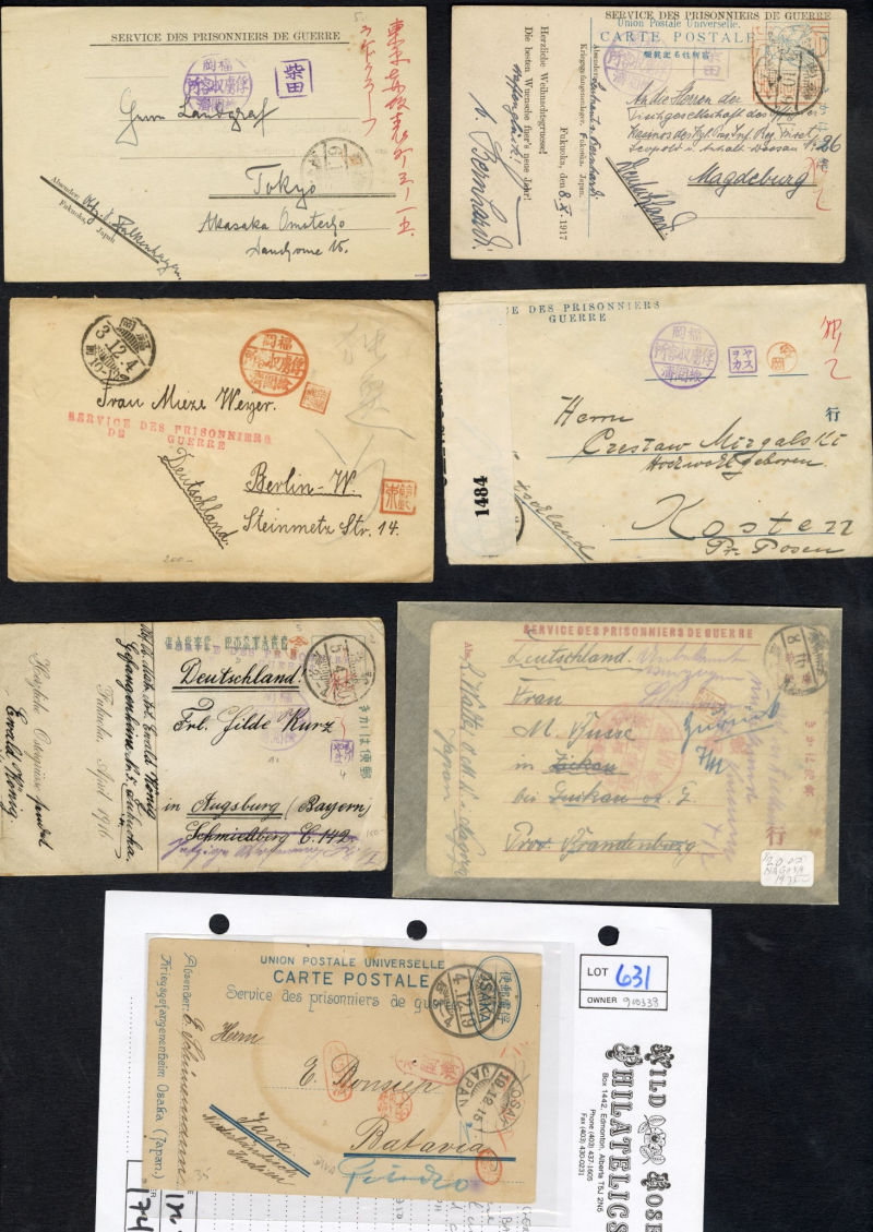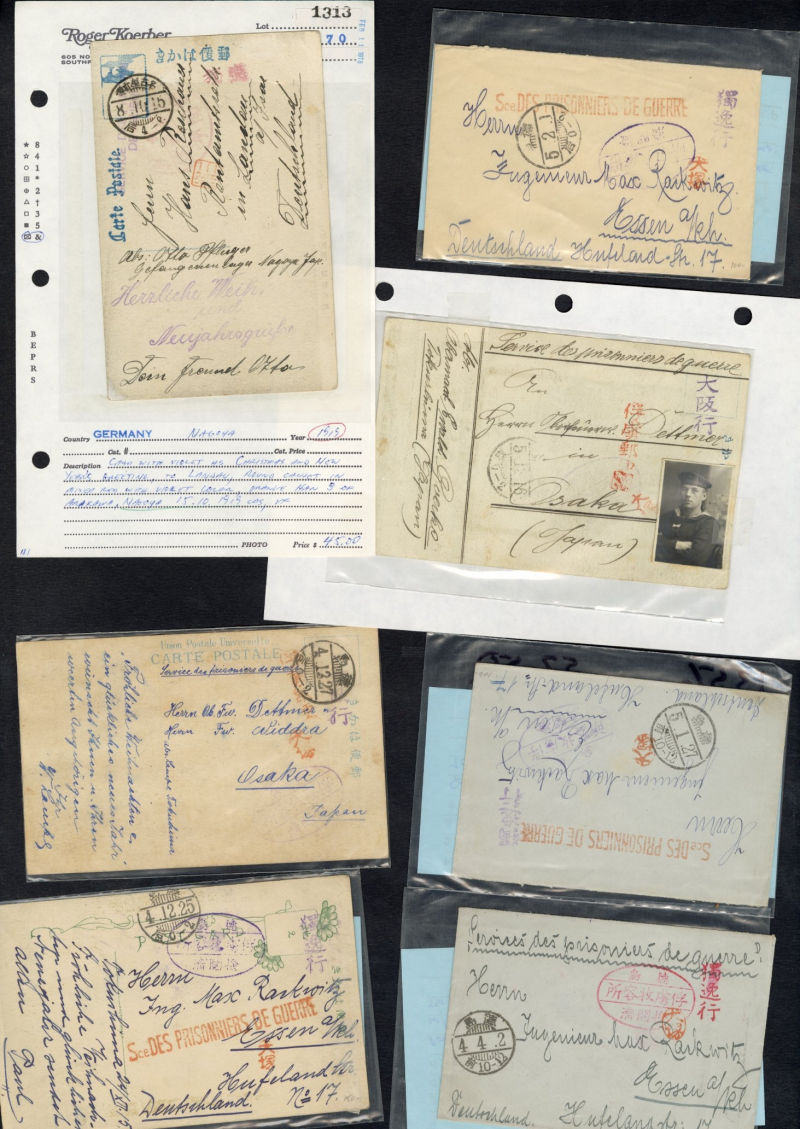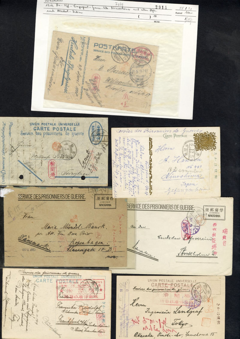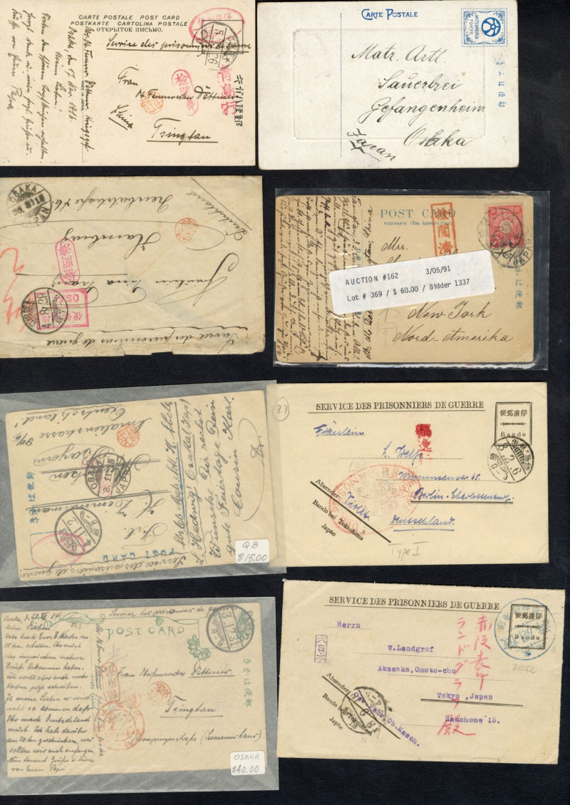 1437 c   imageLARGE LOTS AND COLLECTIONS JAPAN - Covers and Postal History 1915-18 collection of 93 covers, cards from various POW camps in Japan, including Fukuoka (Officers Camps), Matsuyama, Marugame, Nagoya, Naraschino, Bando, Osaka, also several smaller camps, some incoming mail, different destinations and excellent showing of censor markings. In addition, there is a long letter from Max Artelt, who was a renowned escape artist; a leaflet celebrating the birthday of Franz Joseph and a small poster with dedication ("We, the former crew of Tsingtau, dedicate this commemorative sheet to our compatriots in East Asia as an expression of heartfelt thanks for their loyal help"). (After Germany and its allies were defeated in Tsingtao, their soldiers were captured and sent to Japan. More than 4,600 combatant prisoners of war (POWs) were interned in temporary camps in cities throughout Japan. In 1915, after it became clear that the war would last longer than originally expected, Japanese military authorities constructed permanent POW camps to make prisoners' living conditions more tolerable. Though strictly controlled by the military authorities, the prisoners were treated as fellow soldiers in accordance with the Hague Convention of 1907. Despite the fact that the POW camps were encircled by barbed wire, prisoners were not kept isolated from the surrounding society. Ultimately eighty-seven prisoners died in captivity) (Image) (Image 2) (Image 3) (Image 4) (Image 5) (Image 6) (Image 7) (Image 8) (Image 9) (Image 10) (Image 11) (Image 12) (Image 13) (Image 14) (Image 15) (Image 16) (All Images)