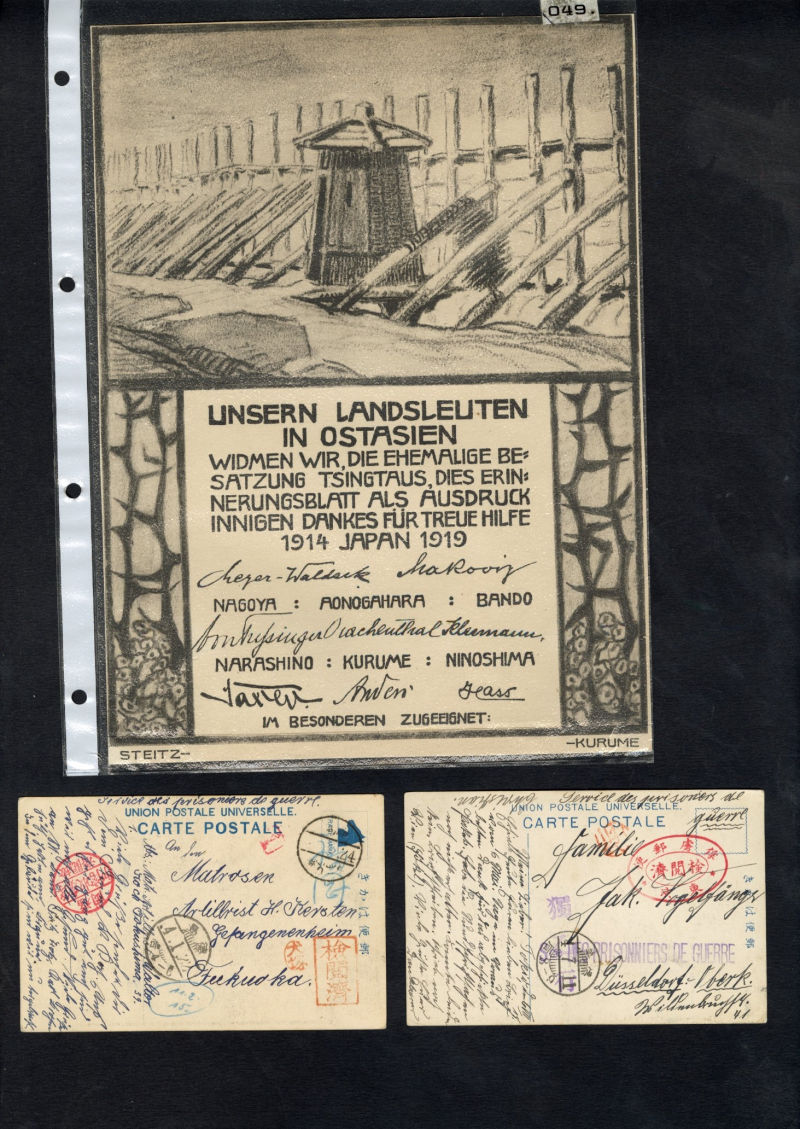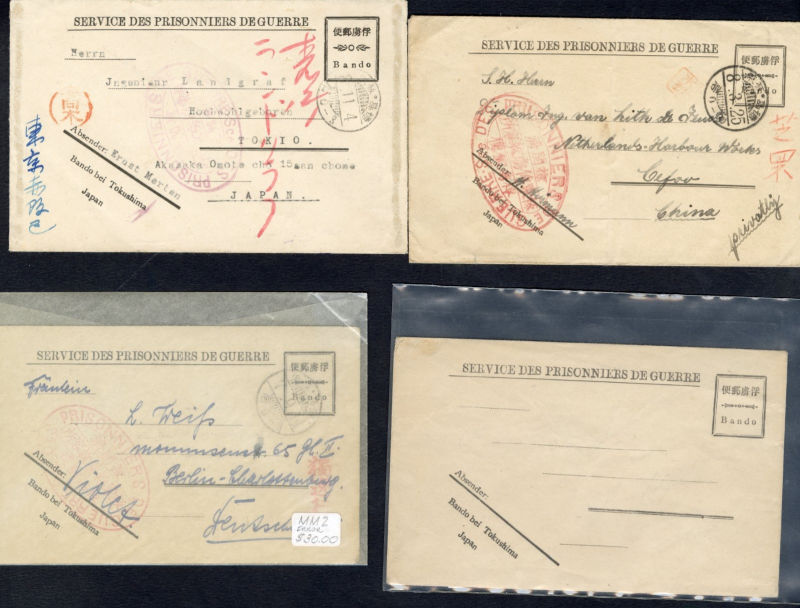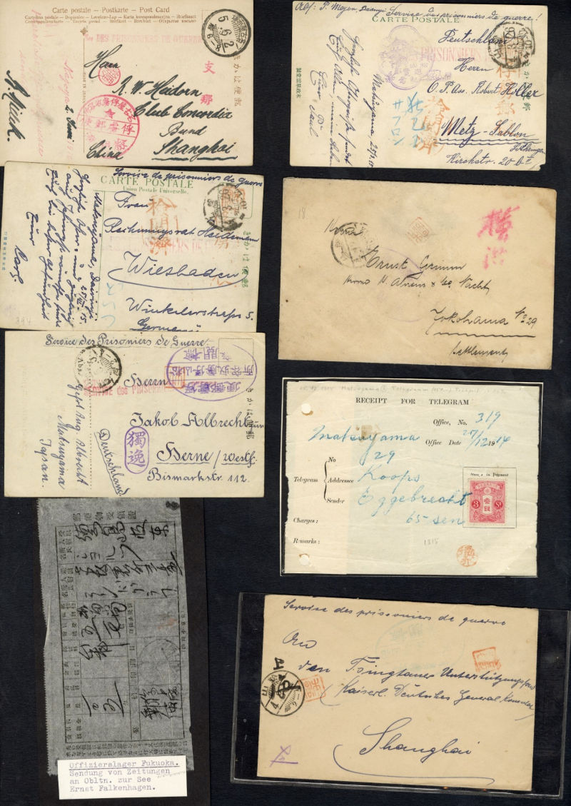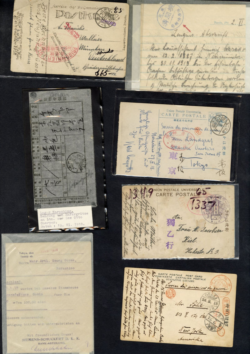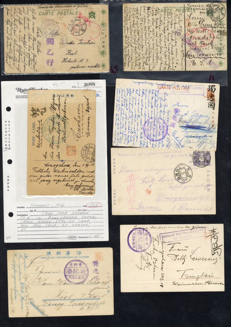 1437 c   imageLARGE LOTS AND COLLECTIONS JAPAN - Covers and Postal History 1915-18 collection of 93 covers, cards from various POW camps in Japan, including Fukuoka (Officers Camps), Matsuyama, Marugame, Nagoya, Naraschino, Bando, Osaka, also several smaller camps, some incoming mail, different destinations and excellent showing of censor markings. In addition, there is a long letter from Max Artelt, who was a renowned escape artist; a leaflet celebrating the birthday of Franz Joseph and a small poster with dedication ("We, the former crew of Tsingtau, dedicate this commemorative sheet to our compatriots in East Asia as an expression of heartfelt thanks for their loyal help"). (After Germany and its allies were defeated in Tsingtao, their soldiers were captured and sent to Japan. More than 4,600 combatant prisoners of war (POWs) were interned in temporary camps in cities throughout Japan. In 1915, after it became clear that the war would last longer than originally expected, Japanese military authorities constructed permanent POW camps to make prisoners' living conditions more tolerable. Though strictly controlled by the military authorities, the prisoners were treated as fellow soldiers in accordance with the Hague Convention of 1907. Despite the fact that the POW camps were encircled by barbed wire, prisoners were not kept isolated from the surrounding society. Ultimately eighty-seven prisoners died in captivity) (Image) (Image 2) (Image 3) (Image 4) (Image 5) (Image 6) (Image 7) (Image 8) (Image 9) (Image 10) (Image 11) (Image 12) (Image 13) (Image 14) (Image 15) (Image 16) (All Images)