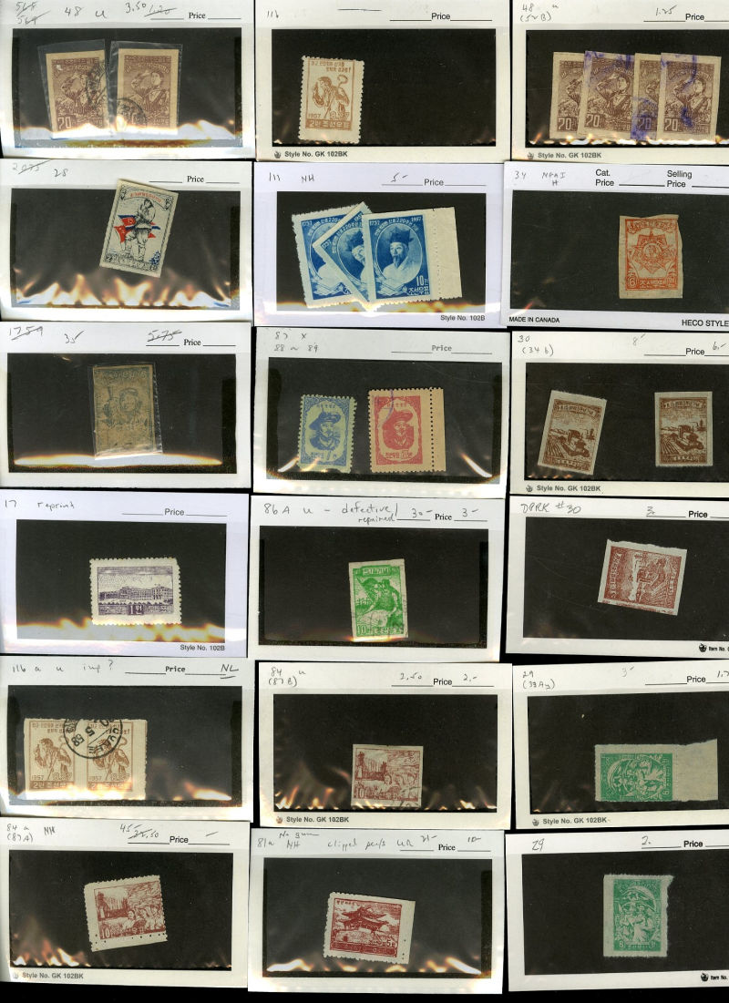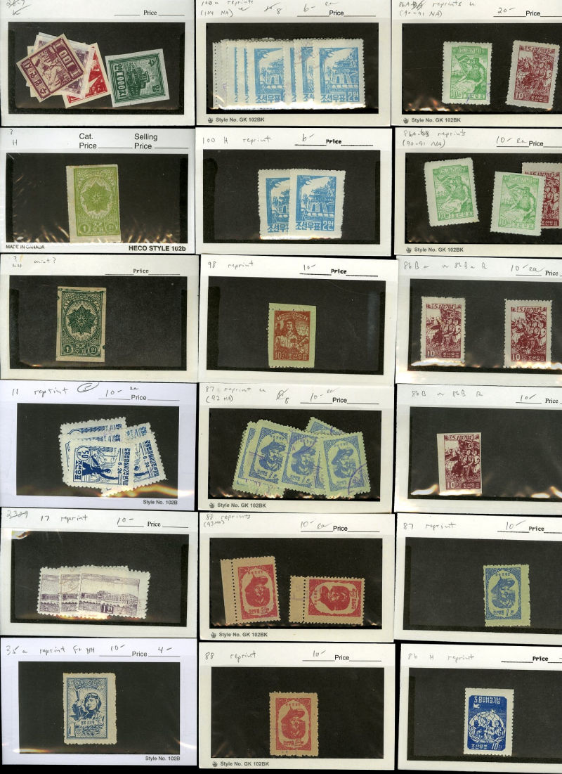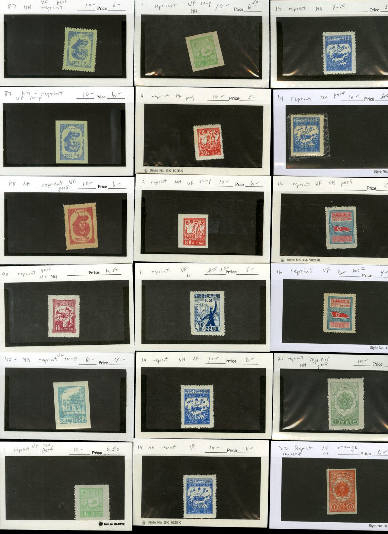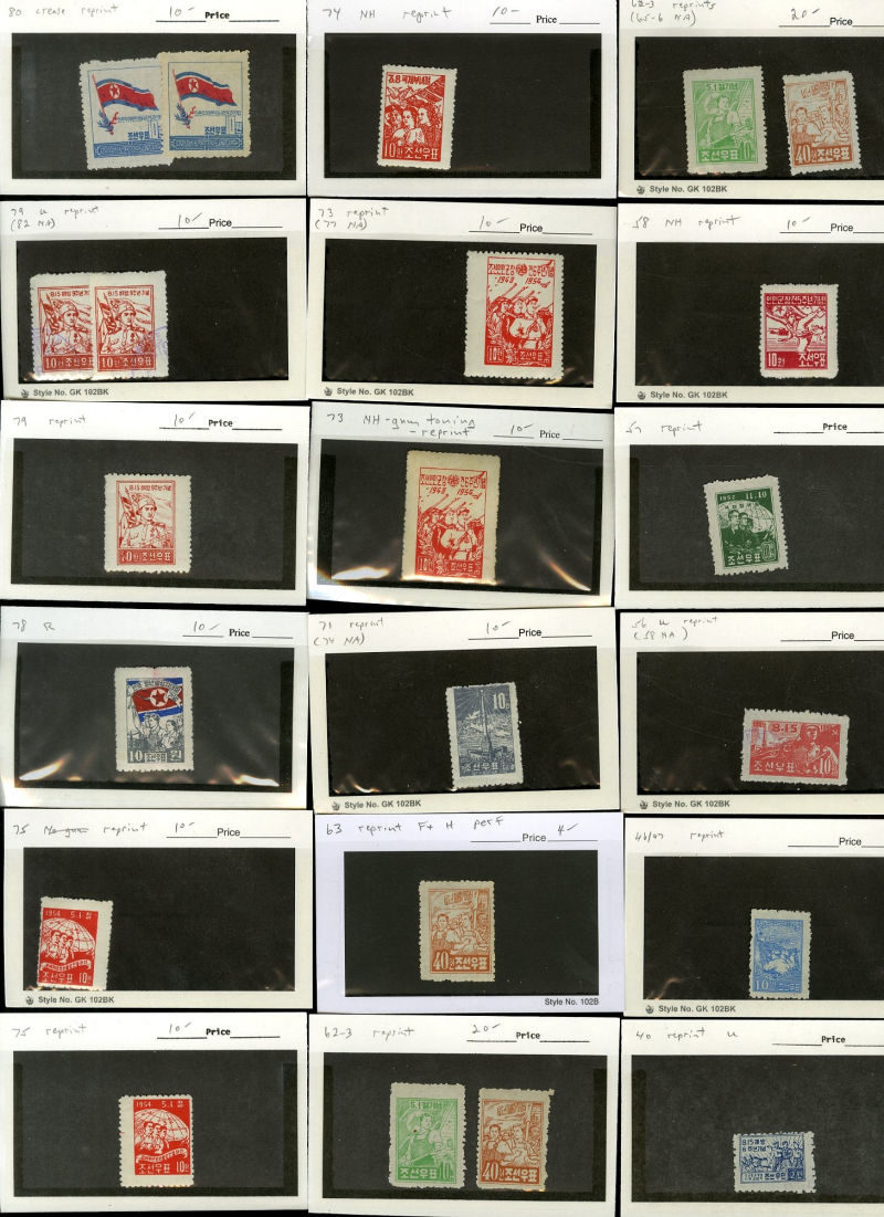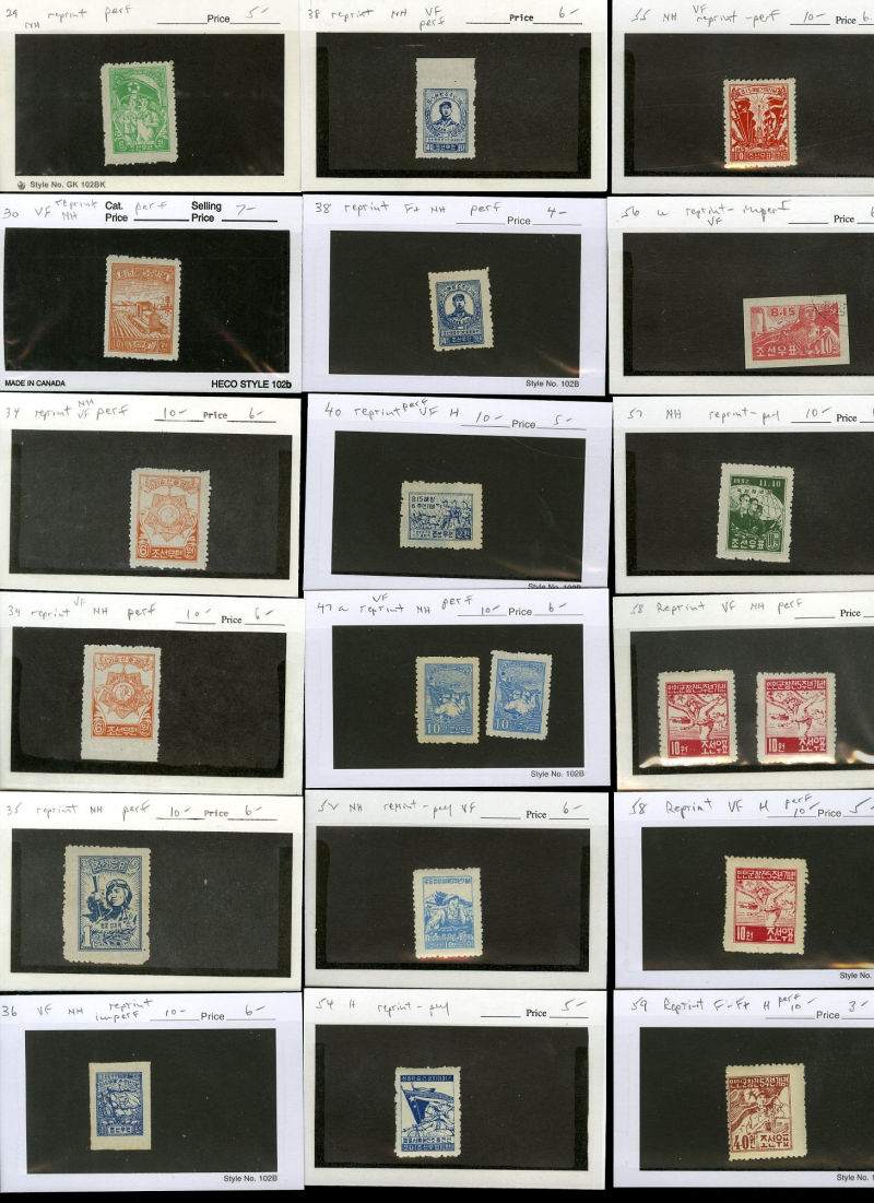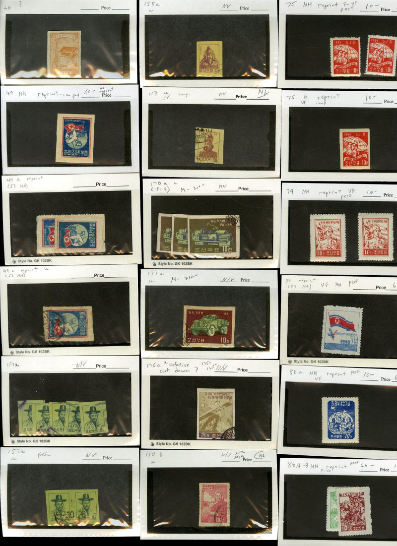 1438 O, og   imageLARGE LOTS AND COLLECTIONS NORTH KOREA 1946-1957 duplicated selection of used and unused singles and sets on small Lighthouse presentation cards, perf. and imperf. Reprints, some unlisted varieties, few multiples, better items, mostly fine, ex-Mary Farber ("Zillions of Stamps") (Image) (Image 2) (Image 3) (Image 4) (Image 5) (Image 6) (Image 7) (Image 8) (Image 9) (Image 10) (Image 11) (All Images)