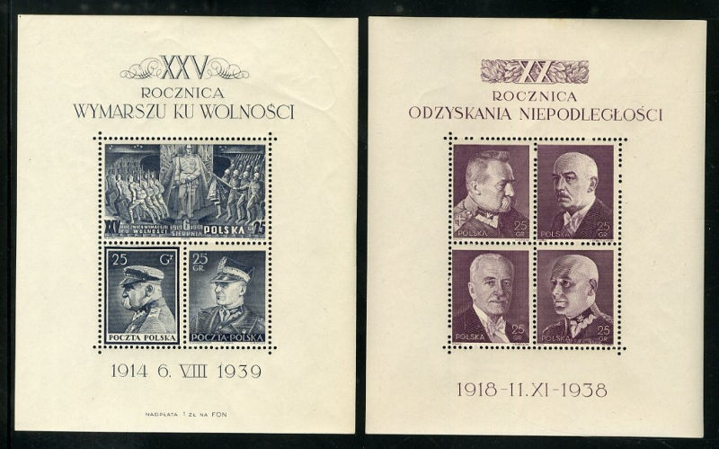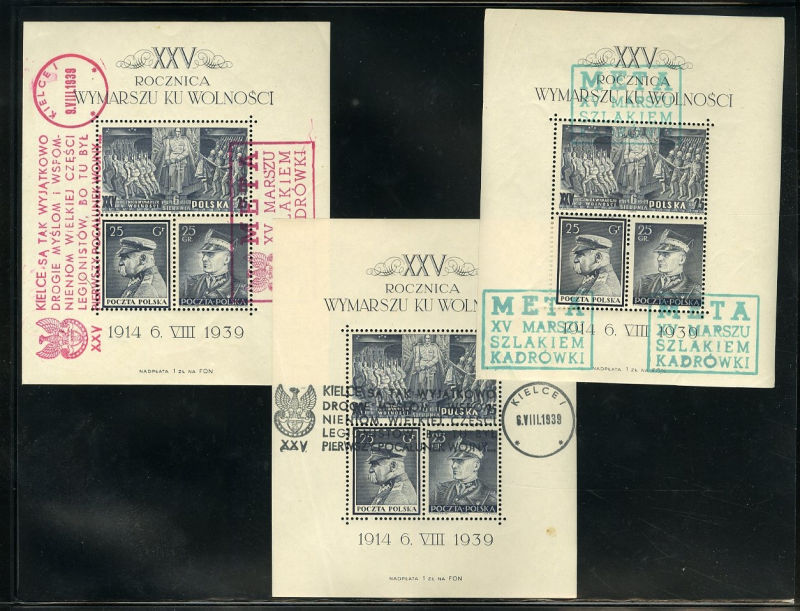 1465 nh, bl   imageLARGE LOTS AND COLLECTIONS POLAND (333,B35) 1938-39 20th Anniversary of Independence souvenir sheet of four (4), 1939 Legions souvenir sheet of three (7), n.h., also three with special commemorative pmks, v.f., cat. Value $498 (Image) (Image 2) (All Images)