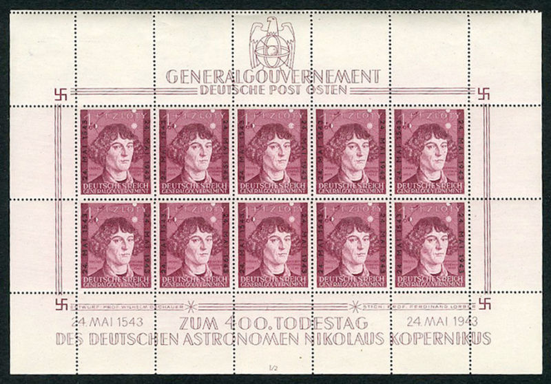1469 og, nh, bl   imageLARGE LOTS AND COLLECTIONS German Occupation - Generalgouvernement Semi-Postals 1943 Copernicus Anniversary issue, 14 souvenir sheetlets of ten, two l.h. in margin, others n.h., fine-v.f. (Mi.104, Euro 400) (Image)