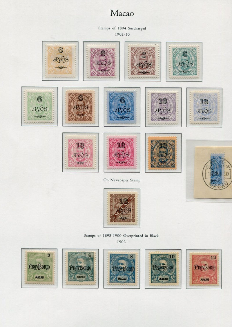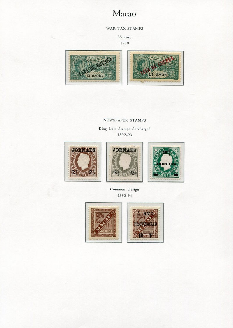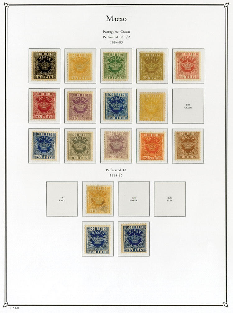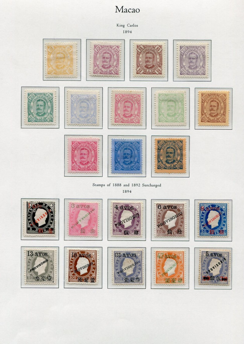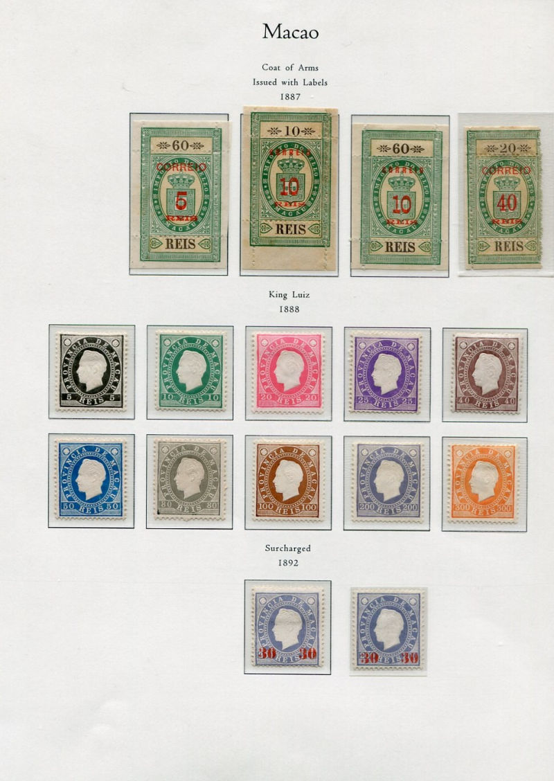 1470 og   imageLARGE LOTS AND COLLECTIONS Macao 1884-1938 comprehensive collection on PALO album pages, unused, missing only the items offered individually in this sale and a few others, Portuguese Crown perf. 13 1/2 and 12 1/2, numerous surcharges and overprints, local provisionals, perforation varieties on 1887 issue, Kings Luiz and Carlos, Provisorio surcharges, Vasco da Gama and other commemoratives, 1898-1910 King Carlos, surcharges and overprints in various colors, Republica overprints, Ceres issues, 1934 San Gabriel, Common Designs, Postage Dues and Newspaper stamps, minor flaws possible, generally fine-v.f., cat. $15,000+ (Image) (Image 2) (Image 3) (Image 4) (Image 5) (Image 6) (Image 7) (Image 8) (Image 9) (Image 10) (Image 11) (Image 12) (Image 13) (Image 14) (Image 15) (Image 16) (Image 17) (Image 18) (Image 19) (Image 20) (Image 21) (Image 22) (Image 23) (Image 24) (Image 25) (Image 26) (All Images)