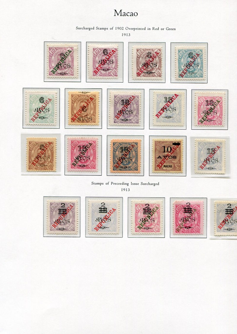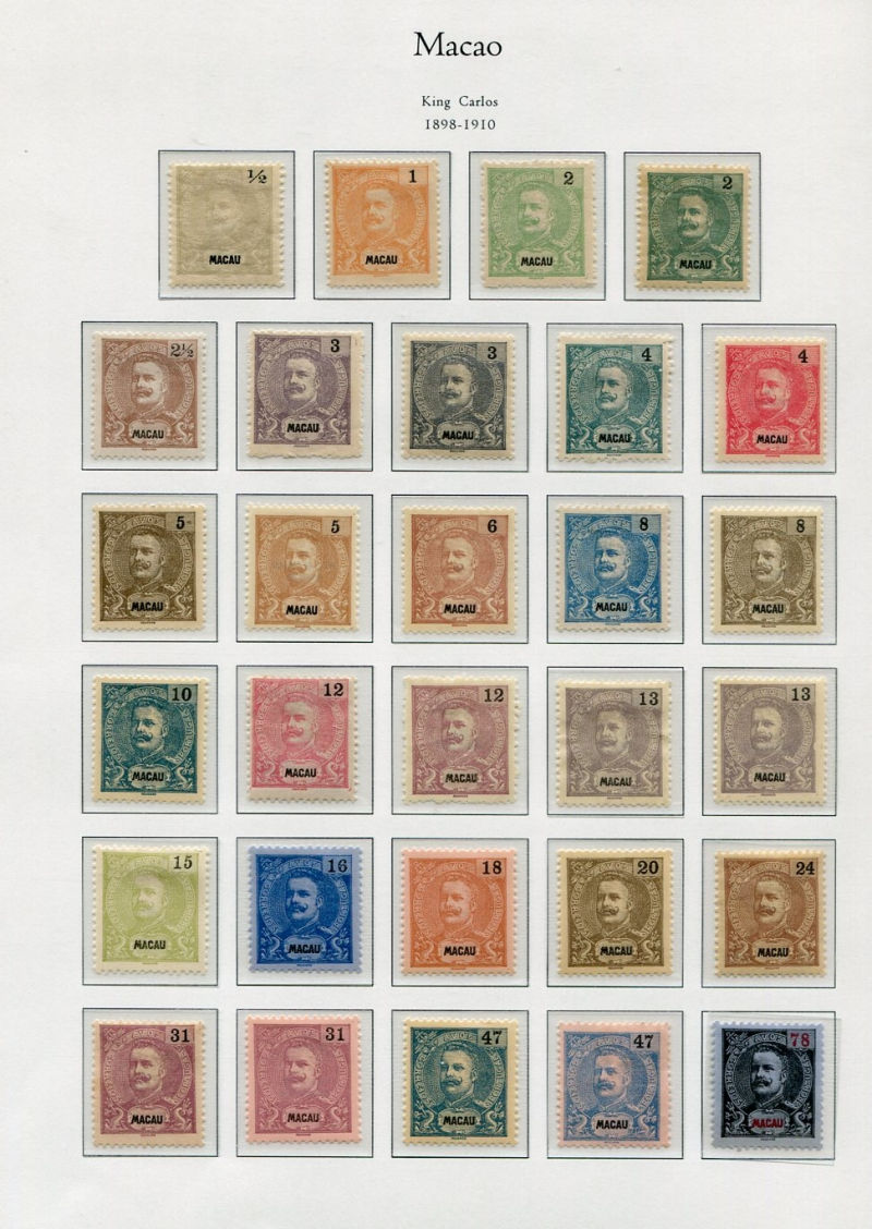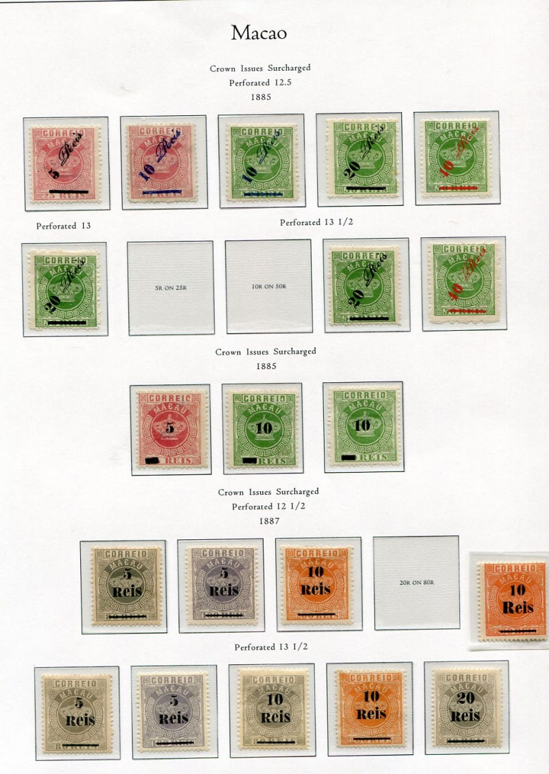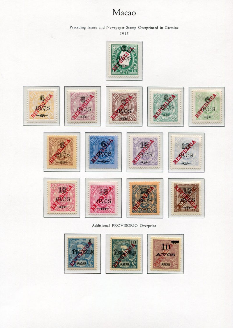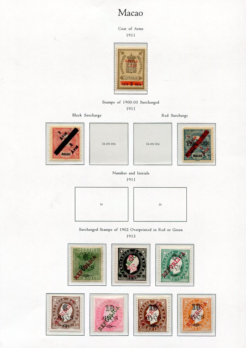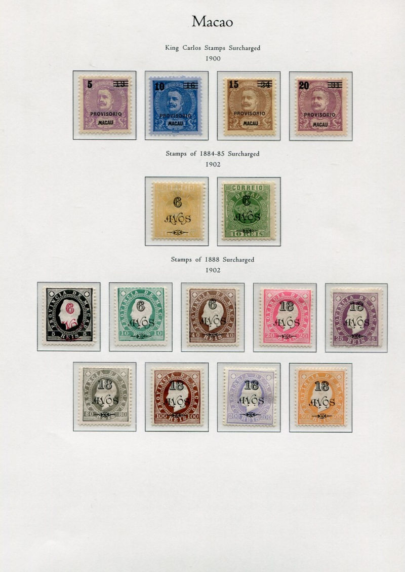 1470 og   imageLARGE LOTS AND COLLECTIONS Macao 1884-1938 comprehensive collection on PALO album pages, unused, missing only the items offered individually in this sale and a few others, Portuguese Crown perf. 13 1/2 and 12 1/2, numerous surcharges and overprints, local provisionals, perforation varieties on 1887 issue, Kings Luiz and Carlos, Provisorio surcharges, Vasco da Gama and other commemoratives, 1898-1910 King Carlos, surcharges and overprints in various colors, Republica overprints, Ceres issues, 1934 San Gabriel, Common Designs, Postage Dues and Newspaper stamps, minor flaws possible, generally fine-v.f., cat. $15,000+ (Image) (Image 2) (Image 3) (Image 4) (Image 5) (Image 6) (Image 7) (Image 8) (Image 9) (Image 10) (Image 11) (Image 12) (Image 13) (Image 14) (Image 15) (Image 16) (Image 17) (Image 18) (Image 19) (Image 20) (Image 21) (Image 22) (Image 23) (Image 24) (Image 25) (Image 26) (All Images)
