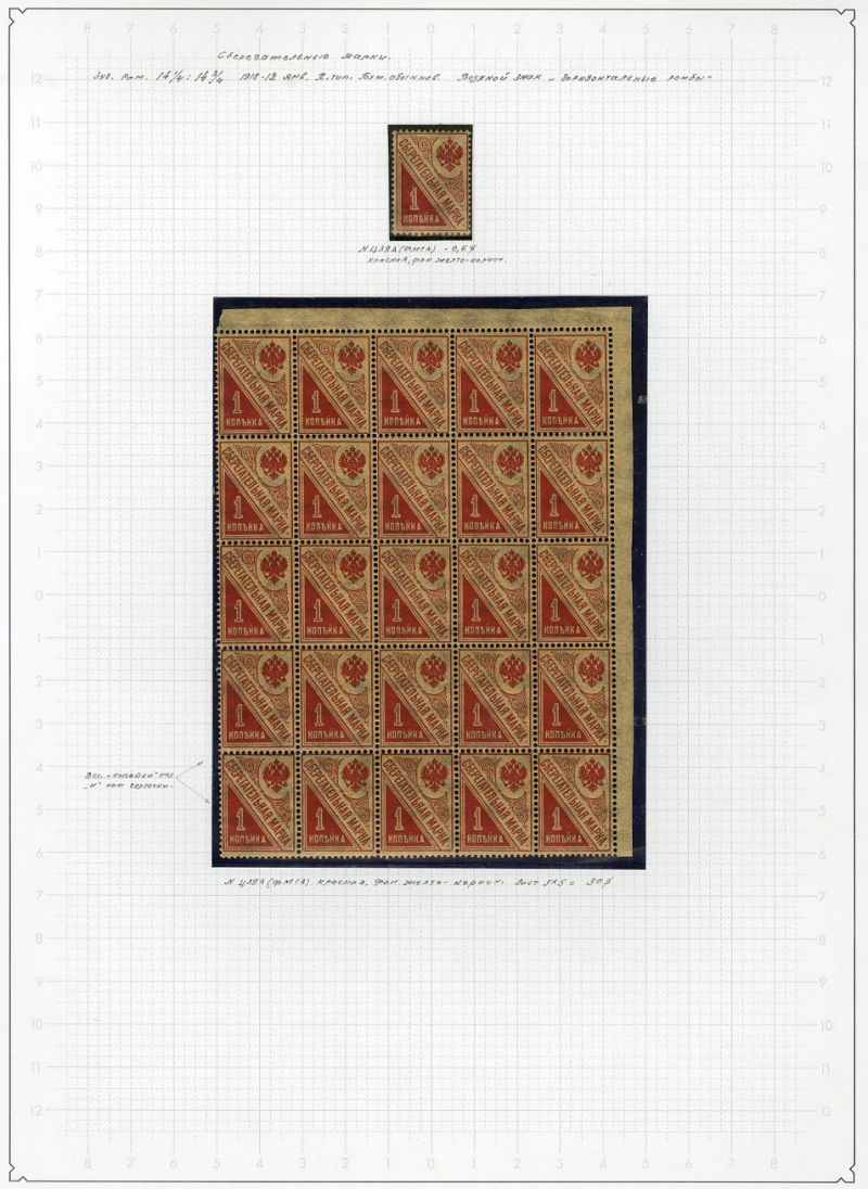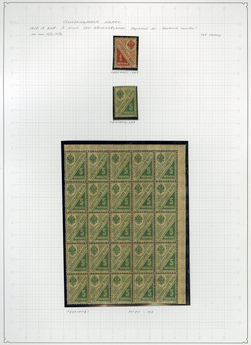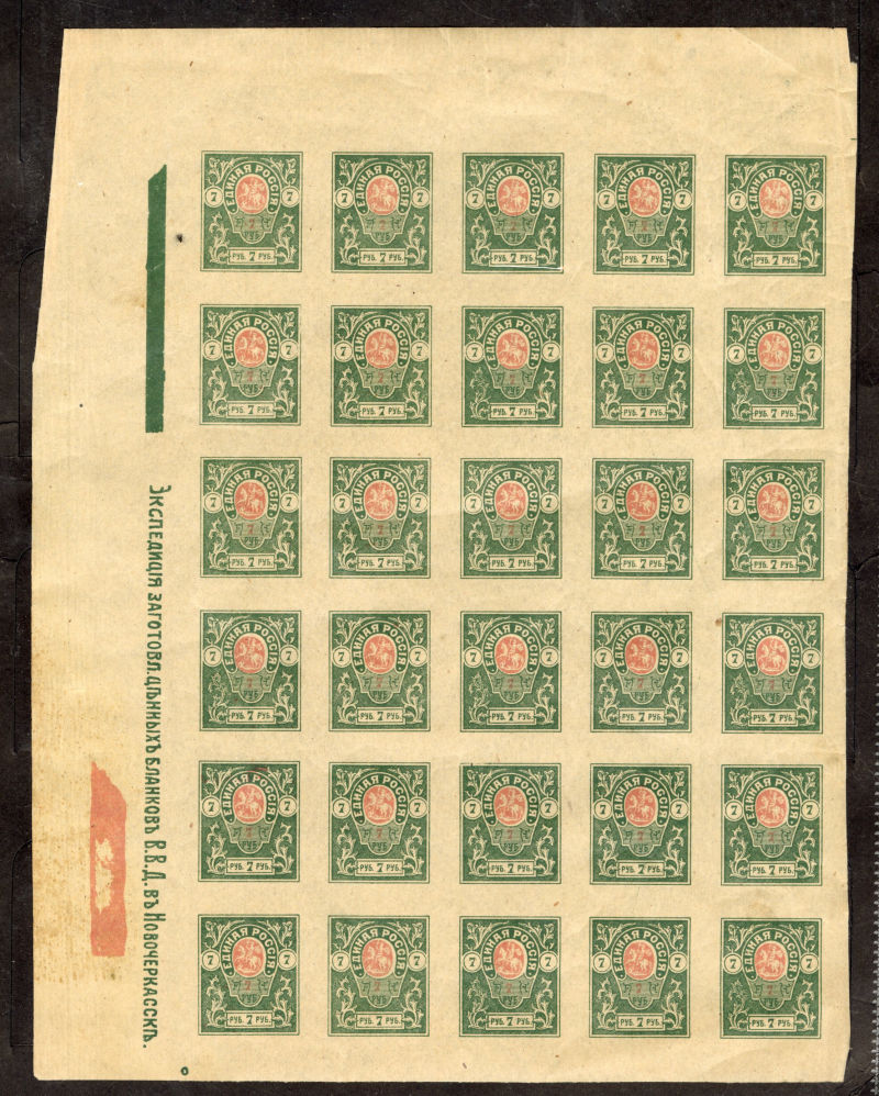 1476 nh, bl   imageLARGE LOTS AND COLLECTIONS RUSSIA - FORMER RUSSIAN REPUBLICS (70) 1919 South Russia. Denikin Issue, 7r Gray green & rose, 1,200 imperforate stamps, mostly in panes of 30, with sheet margins, n.h., fine-v.f., cat. Value $2700 (Image)