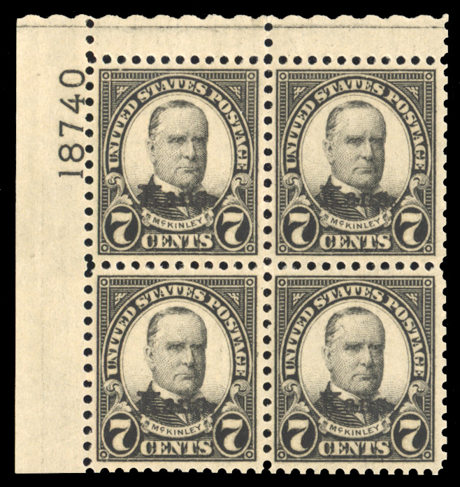 States 1917-29 Issues (665) 1929 7c black, upper left Plate No. Block of four, n.h., with 2024 PFC graded "VF 80" (catalogued as an ungraded plate block) cat. Value $700