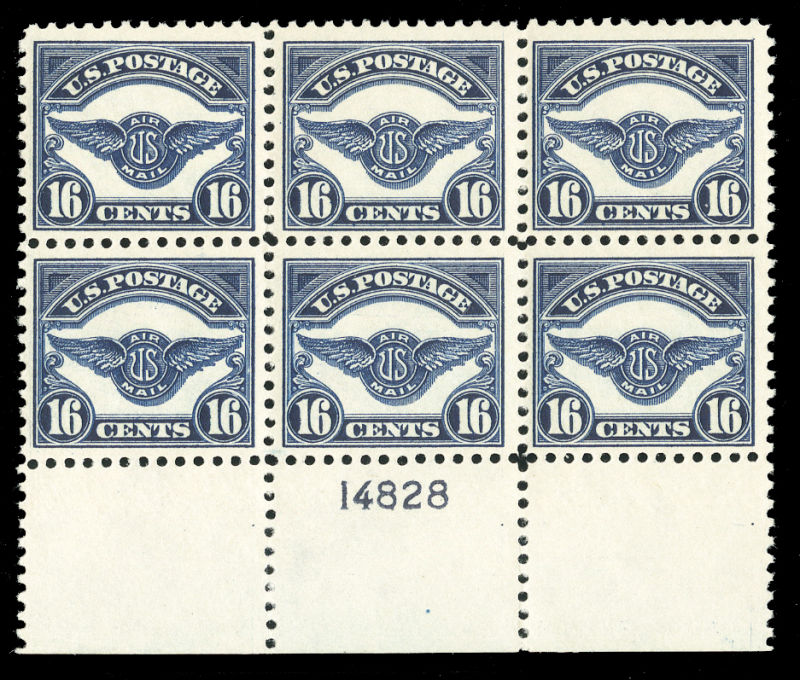 States - Air Post (C5) 1923 16c dark blue, bottom margin plate number block of six, n.h., well centered, fine-v.f., with 2009 PFC and 2023 PSE certificate, cat. Value $2000