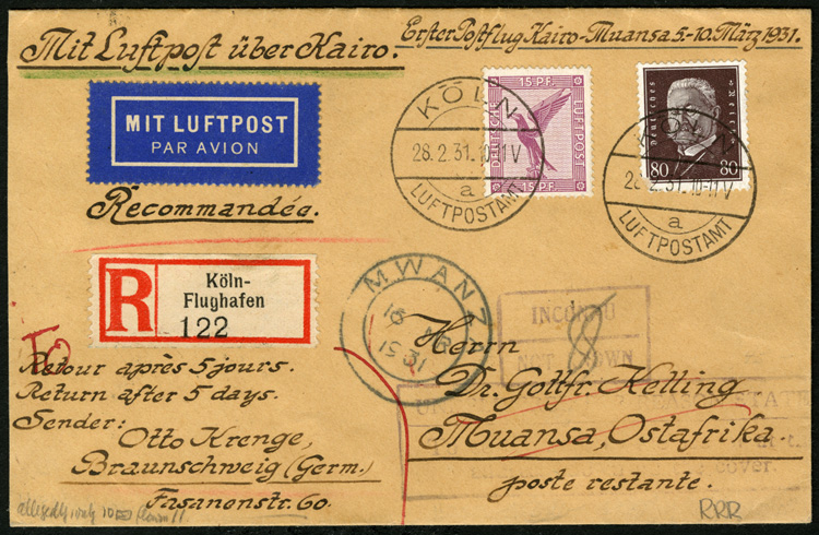 Flight Covers 1931 (28 Feb) First Flight cover, registered from Cologne, via Cairo to Mwanza, East Africa, with Alexandria transit and arrival pmks, addressee unknown, registered back from Mombasa to Germany, with Brunswick arrival, v.f., undoubtedly