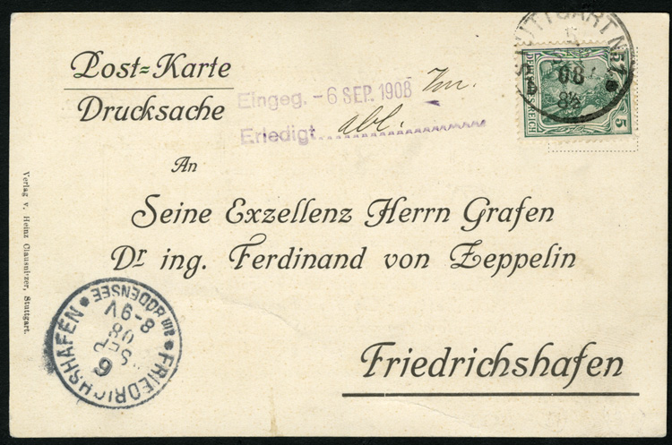 Zeppelin Flights 1908 (6 Sep) pre-printed "thank you" card addressed to "His Excellency Count Dr. Ing. Ferdinand von Zeppelin" in Friedrichshafen, with arrival pmk. Posted in Stuttgart, the card depicts a verse in which the people thank Count