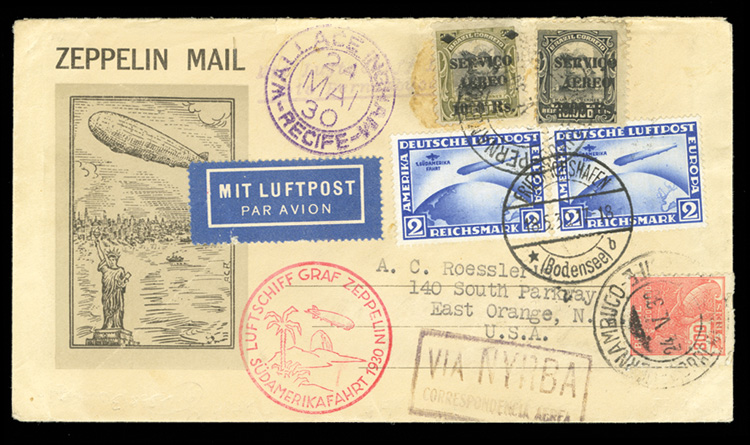 Zeppelin Flights 1930 Roessler cacheted cover with German franking (2x2m South America), canceled in Friedrichshafen (18 May) to Brazil, where three stamps were added and canceled Recife (24 May), red South America Cachet and "Via NYRBA