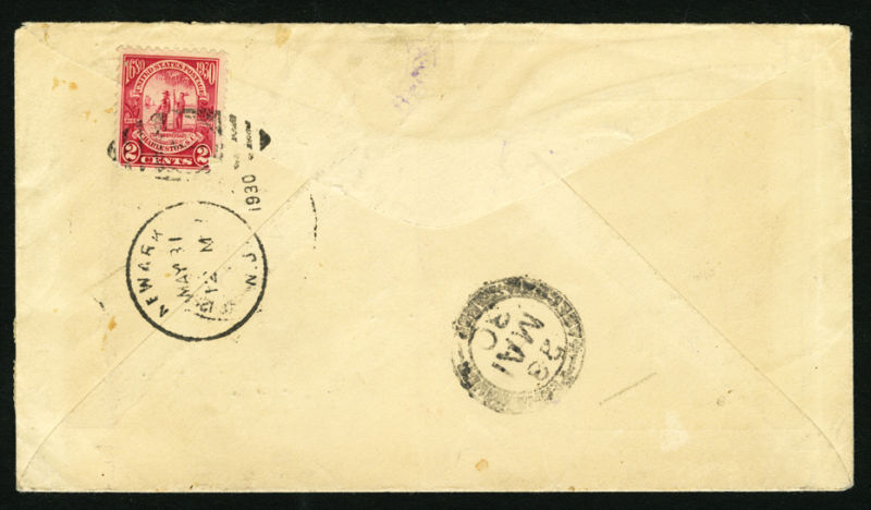 Zeppelin Flights(C38-39) 1930 (14 Apr) large-size cover originating in New York, with 5c franking (Roosevelt), used in combination with German South America 2M and 4M set of two (Mi.438-439), canceled on board (22 May), with Seville drop cancel on