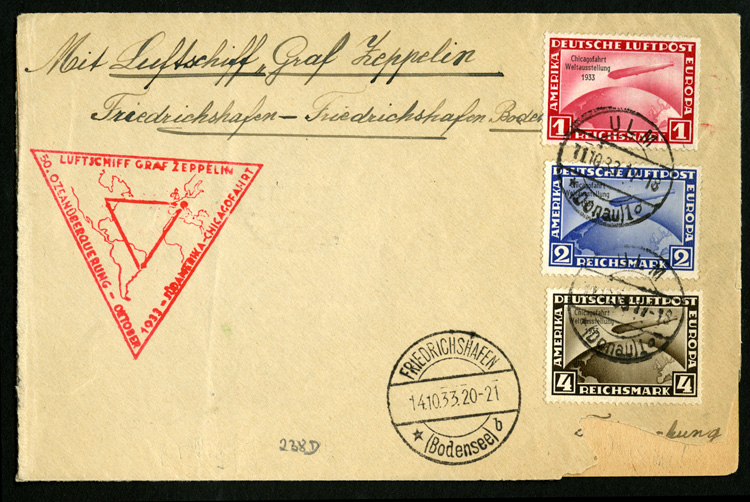 Zeppelin Flights(C43-45) 1933 Chicago Flight, set of three used on round-trip cover from Ulm to Friedrichshafen, cover defective at bottom, stamps fine-v.f. (catalogued as used off cover) cat. value $800 (Image)