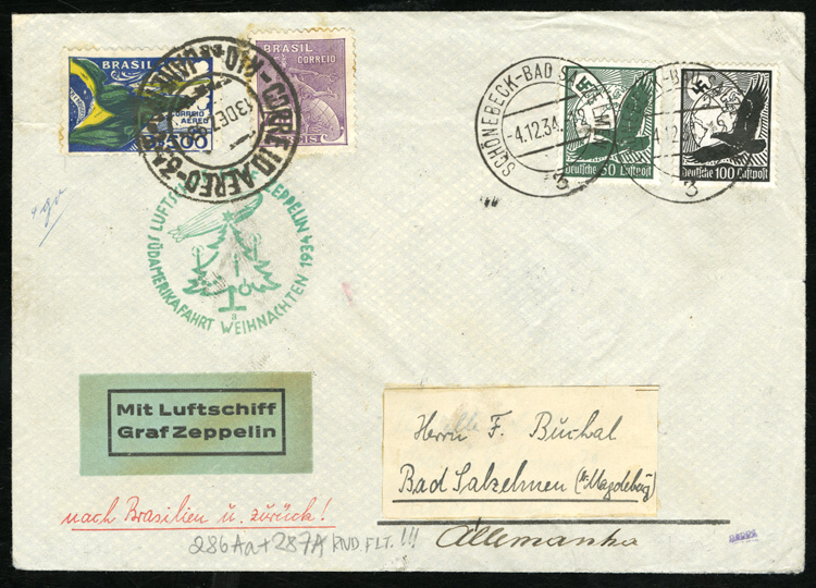 Zeppelin Flights(Si.286Ba) 1934 round-flight with German and Brazilian franking, Christmas flight cachet, Condor-Zeppelin markings on back, little perf. toning, otherwise fine, signed Gappe (Image)