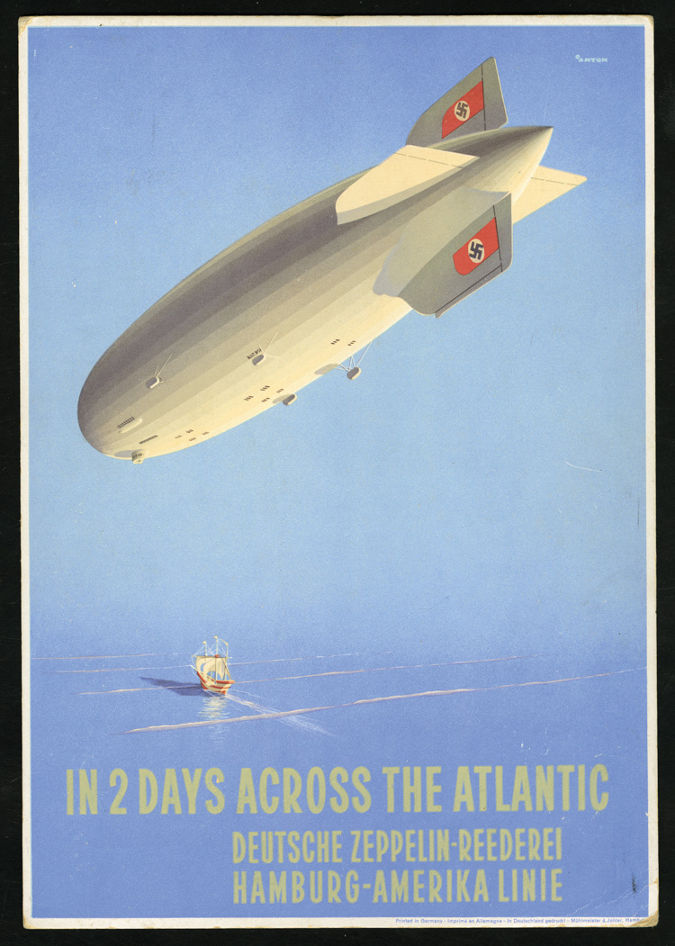 Zeppelin Memorabilia 1936 Hindenburg flight, original multi-color cardboard poster "In 2 Days Across the Atlantic Deutsche Zeppelin Reederei Hamburg-Amerika Linie" (20.5 x29.5cm), converted to a desk stand, minor faults at bottom, otherwise fine,