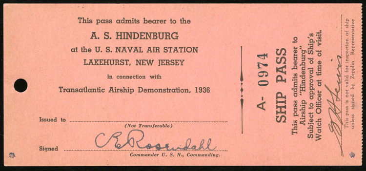 Zeppelin Memorabilia 1936 Ship Pass signed by Commander U.S.N Rosendahl - "This Pass admits bearer to the A.S. Hindenburg at the U.S. Naval Air Station Lakehurst, New Jersey", v.f. (Image)