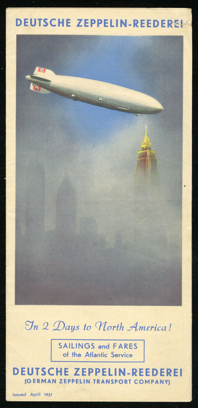 Zeppelin Memorabilia 1937 Hindenburg flight, pamphlet in blue "In 2 Days to North America German Zeppelin Transport Company", minor flaws, fine (Image)