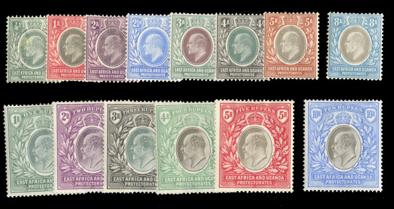 COMMONWEALTH EAST AFRICA & UGANDA (1-14) 1903 KEVII, 1/2a-10r, set of fourteen, l.h. or h.r., 2r with slightly disturbed gum, fine-v.f., cat. value $1416 (Image)