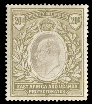 COMMONWEALTH EAST AFRICA & UGANDA (30) 1904 KEVII, 20r olive gray & black, h.r., well centered, fine, cat. value $1050 (Image)