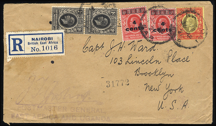 COMMONWEALTH EAST AFRICA & UGANDA (40/62) 1921-22 two registered covers from Nairobi to USA, variety of frankings, fine-v.f. (Image)