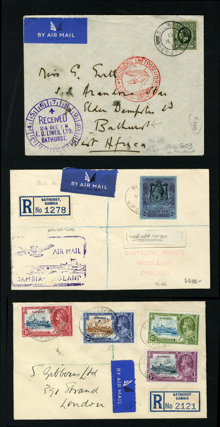 COMMONWEALTH GAMBIA Flight Covers 1935-1936 three covers, including 1935 (18 Nov) registered and flown to London, franked with complete set of four Silver Jubilees, also 11 March (1936) registered and flown from Bathurst to England, franked with 2sh
