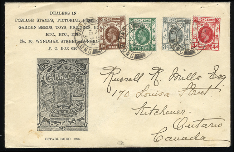 COMMONWEALTH HONG KONG 1936 two advertising covers (Graca & Co. Stamp Dealers) to Canada, franked with a total of 8 adhesives, one with some defects and stained, other v.f.