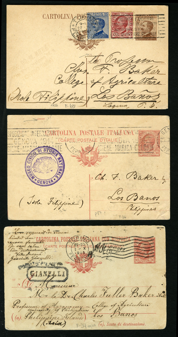 1914-26 three postal cards, one with additional franking used from Torino and Genova to Los Banos, Philippines, fine (Image)