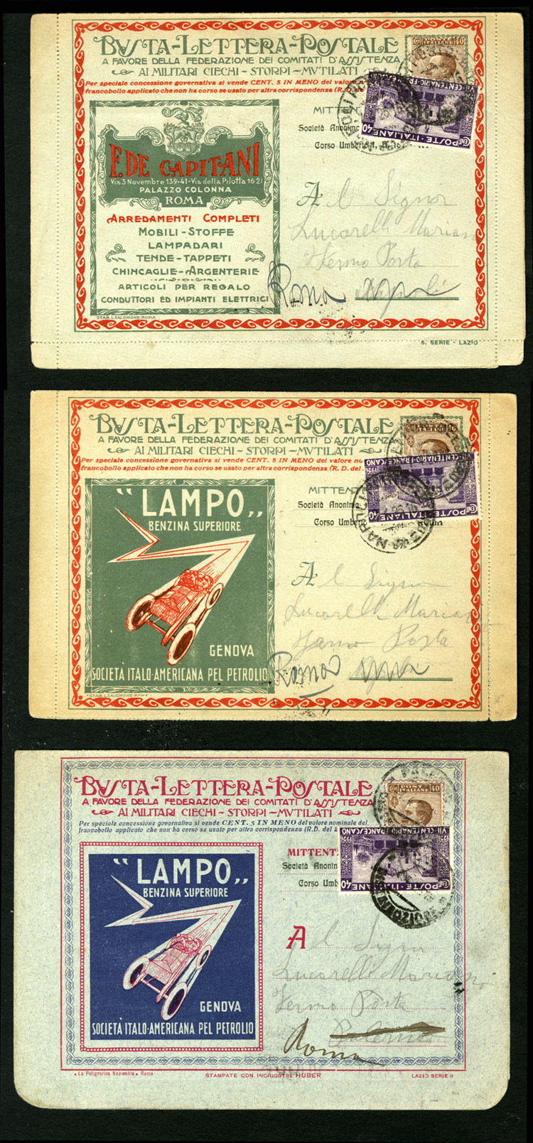Semi-Postals (B13) 1922 "BLP", three different advertising lettersheets, each with 40c franking, plus additional 40c commemorative adhesive, sent to Rome, fine-v.f.