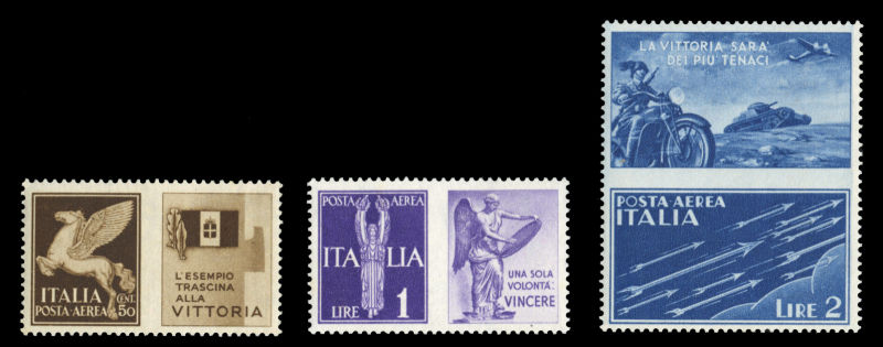 Post 1942 50c, 1L and 2L War propaganda set of three with labels, n.h., v.f., see note in Scott following C19 (Sass. Euro 2,000), cat. value $1400 (Image)