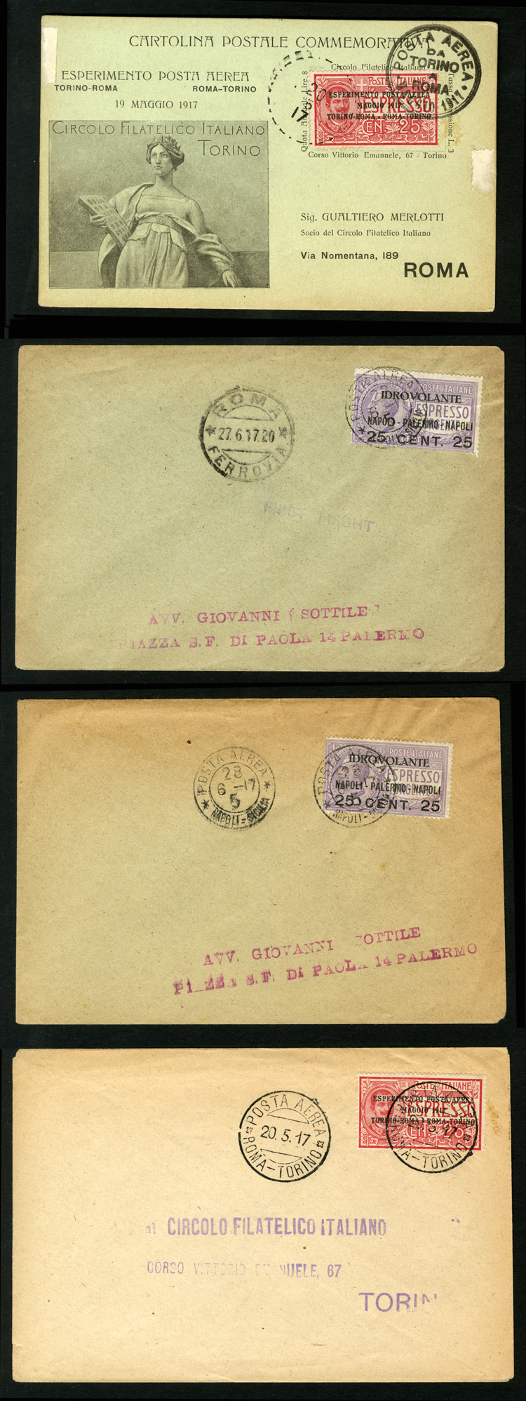Flight Covers(C1-2) 1917 Rome-Turin and Turin-Rome first flight cover and card, also Naples-Palermo and Rome-Naples-Palermo two first flight covers, minor cover adhesions or tears, fine-v.f. (Image)