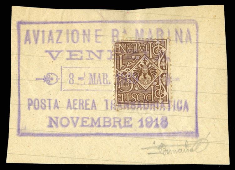 Flight Covers 1918 (Nov) Posta Aerea Transadriatica/Venezia, complete cachet tying 1c adhesive on piece, fine, with pencil signature at bottom (Image)