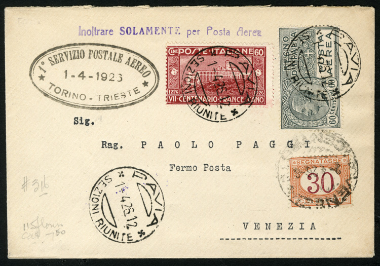 Flight Covers 1926 (1 Apr) first flight cover from Pavia to Venezia, Torino-Trieste route, appropriate franking and oval cachet, 30c Postage Due applied on arrival, v.f.