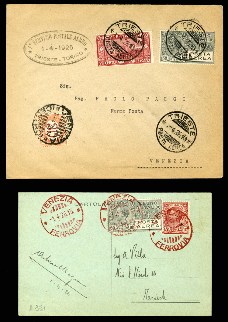 Flight Covers 1926 (1 Apr) first flight S.I.S.A. postal card from Venezia to Trieste, appropriate franking tied by red Venezia-Ferrovia cds, also Trieste to Venezia flown cover with appropriate cachet and franking, 30c Postage Due added on arrival,