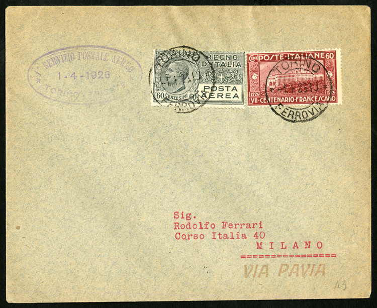 Flight Covers 1926 (1 Apr) first flight cover via Pavia to Milano, Torino-Trieste route, appropriate franking and oval cachet, fine cover, with arrival pmk (Image)