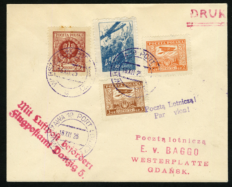Flight Covers 1925 (16 Dec) Warszawa to Westerplatte/Gdansk, flown card with 10gr L.O.P.P. adhesive, used in combination with 2gr, 3gr and 25gr stamps, red "Mit Luftpost befordert Flugpost... (Image)