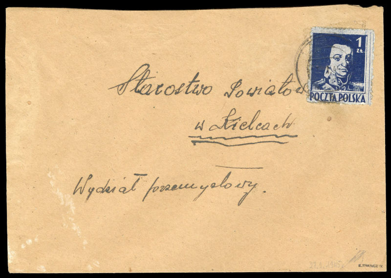 (343) 1945 (25 Jan) cover from Lublin (?) to Kielce, franked with 1zl dark blue, paying correct double rate, with Polish Military Censor No.1785 hs on back, signed Krawczyk (Fi.12,000zl) (Image)