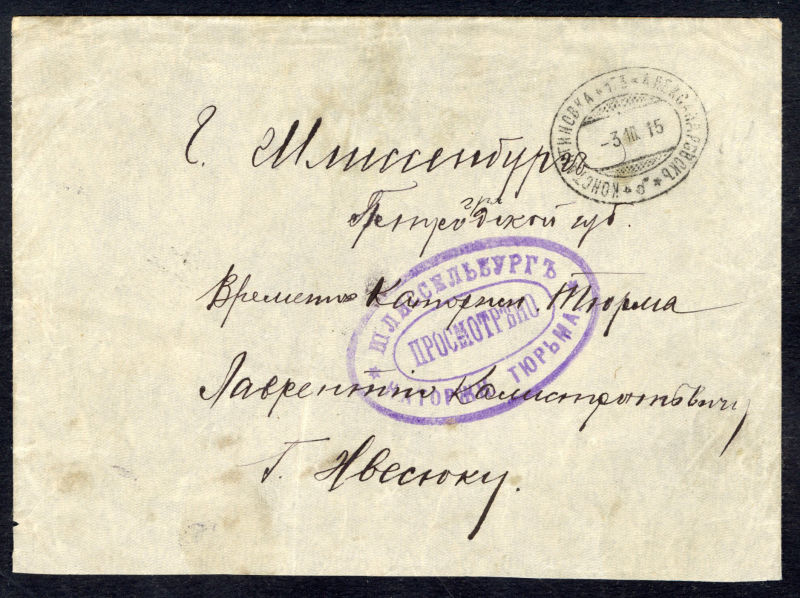 1915 (3 Oct) cover from Konstantinovka to Shlisselburg Prison, franked on back with 3k Arms and 7k Romanov, with oval censor handstamp on front, filing folds and some toning, fine incoming... (Image) (Image 2)