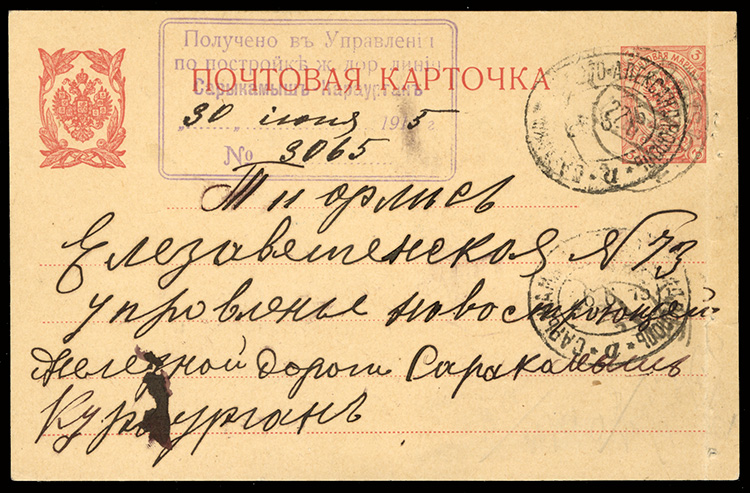 1915 (6 June) postal card to Tiflis, with oval "Sarikamish Novo-Aleksandropol" in oval, also "Polucheno v Upravleni I po Postrok z.dor. Linii Sarikamsh-Karaurgan" in violet, archival staple... (Image)