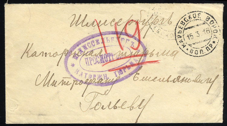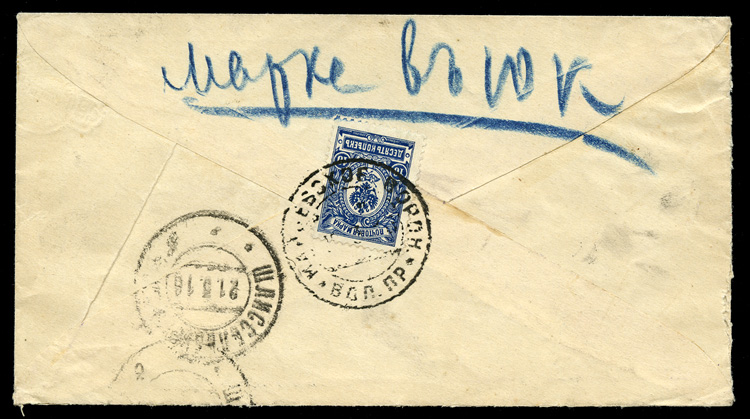 1916 (15 Mar) cover franked on reverse with 10k blue, used from a small village to a prisoner held in the infamous Schlisselburg prison, with large "examined/Schlisselburg Prison" censor... (Image) (Image 2)