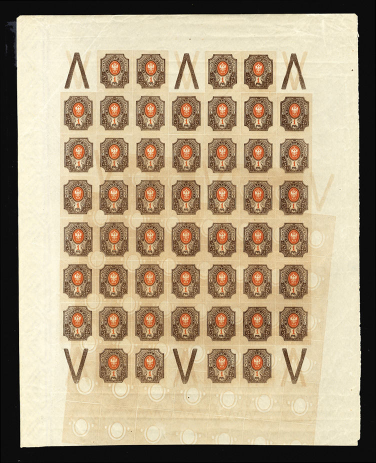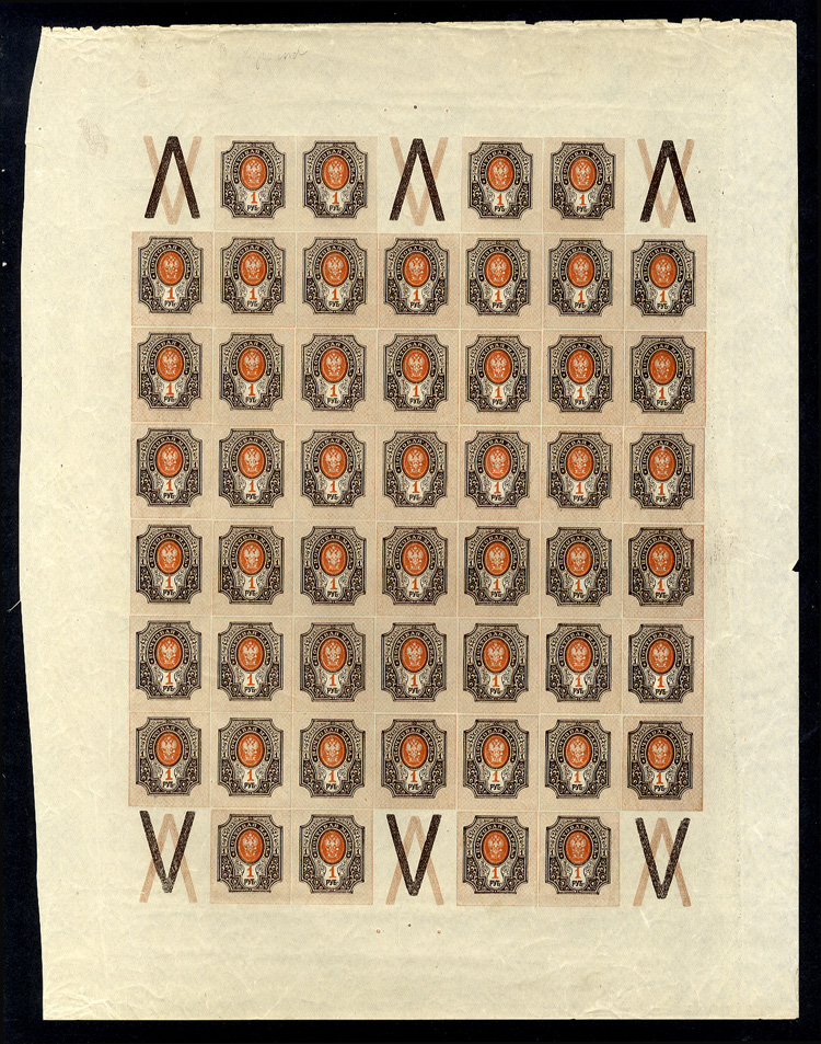 1917 1r carmine and brown (vertical lozenges of varnish), imperforate sheet of 50 (vertical format with six labels), double background, one inverted and displaced, some creases, n.h., v.f. (Image)