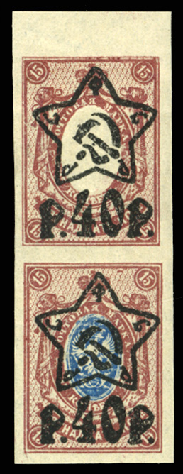 (227var) 1922 40r on 15k imperf. vertical pair, top stamp variety missing center, n.h., v.f., signed Rosselevitch. An outstanding showpiece (Image)