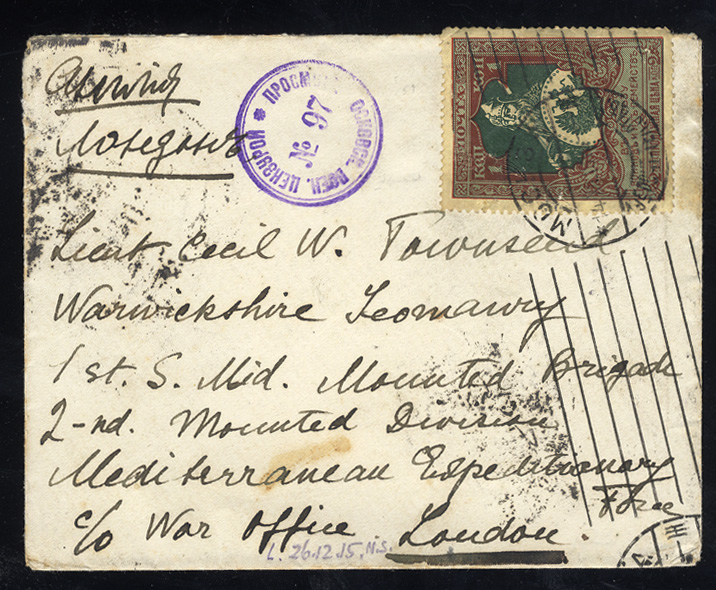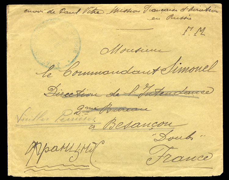Flight Covers 1917 French Aviation Mission to Russia, Military Mail (F.M.) cover to France sent by the mission member (Paul Vitre, "Mission Francaise d'Aviation en Russe"); faint but legible... (Image)