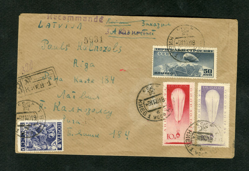 Air Post (C23a) 1931 50k gray blue (error), used in combination with additional 80k franking on registered cover from Kiev (9.11.40) to Riga, with arrival slogan cancel on back, fine and... (Image)