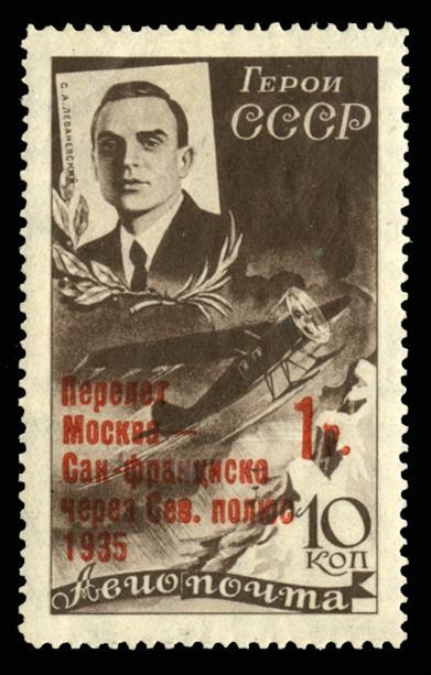 Air Post (C68b) 1935 Moscow-San Francisco 1r surcharge, small "f" in "San Francisco", h.r., v.f., signed Goznak, cat. value $1500 (Image)