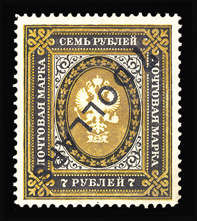 Russian Offices in China (22var) 1904-8 "7 Dollars" on 7r, surcharge inverted, h.r., v.f. and fresh, signed Romeko, etc. Only one sheet of 25 recorded (Image)