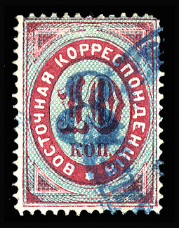 Russian Offices in China (11) 1904 overprinted "Kitai" in red on vertically laid paper, 10k blue, showing part of Chifu pmk, well centered, fine, very rare (Mi.7y, Euro 2,500) (Image)
