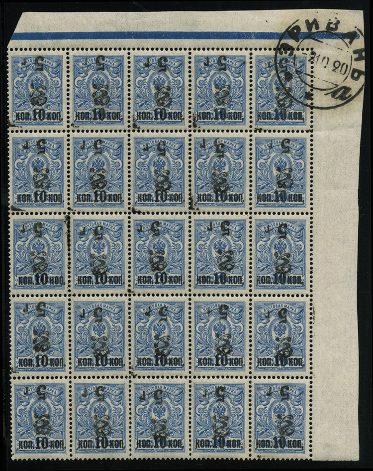 1920 5r on 10k/7k new surcharge and monogram inverted, pane of 25, with Erevan control cds at upper right, n.h., v.f. (Image)